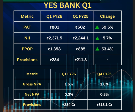 Yes Bank’s Q1FY26 net profit surged 59% to Rs 801 crore, driven by lower funding costs and steady asset quality. The 20% stake acquisition by Sumitomo Mitsui Banking Corporation is expected to conclude by September, marking a key milestone in Yes Bank’s growth strategy.